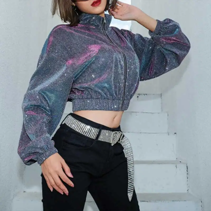 المنتجات ذات الصلة ل Jackets و 2019 الربيع النساء معدنية سترة الفضة طويلة الأكمام عالية طوق لامعة واقية قميص الأزياء محب مثير النادي المحاصيل قمم