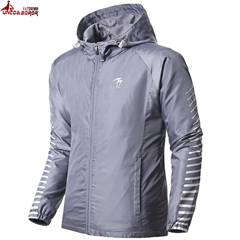 صور ل UNCO و BOROR 2018 الصيف جديد الرجال سترة واقية المطبوعة شريط الربيع الرياضية سترة أزياء عارضة الرجال رقيقة جاكيتات معطف مقنع