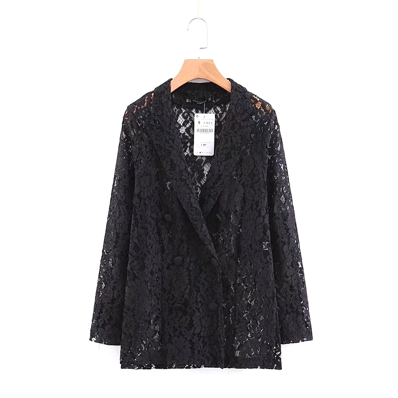 أرغب في شراءمعلومات اضافية BBWM امرأة زا مثير فستان من الدانتيل سترة خمر شيك مزدوجة الصدر معطف بدوره إلى أسفل طوق طويلة الأكمام عارضة Casaco فام