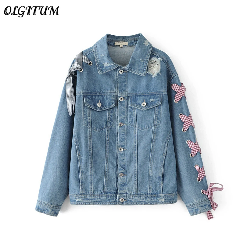 المنتجات ذات الصلة ل Jackets و الربيع/الخريف جديد بلون غسلها الدنيم سترة الأزياء ثقوب الدينيم معطف bowknot الأشرطة أبلى النساء فضفاضة الدنيم سترة معطف