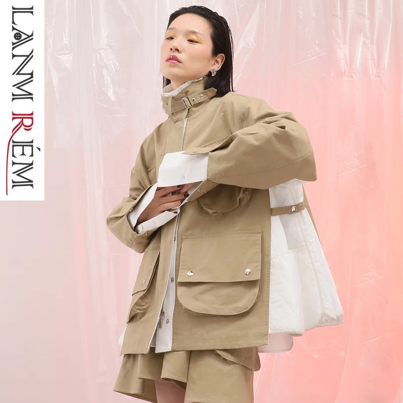 المنتجات ذات الصلة ل Jackets و LANMREM 2019 الربيع التباين اللون خليط المعتاد سترة للنساء الوقوف طوق مزدوجة كبيرة جيوب معطف قصير تصميم JG801